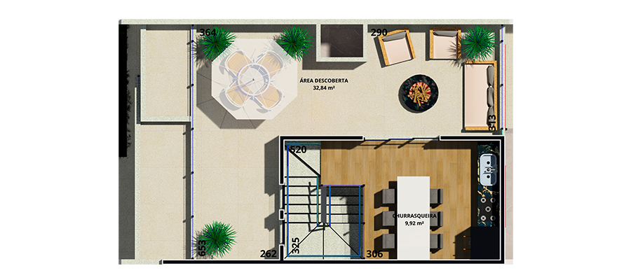 Churrasqueira gourmet integrada ao terraço descoberto, sendo um local incrível para receber amigos.
