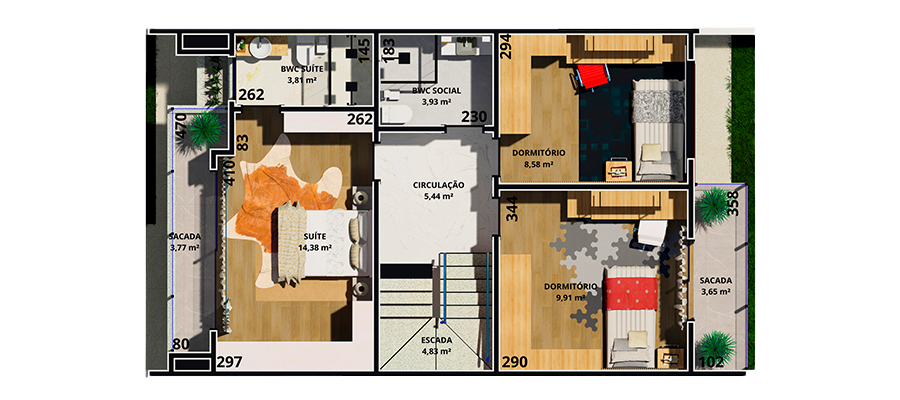 Suíte com mais de 14m², permitindo diversas configurações de layout de projetos de interior.